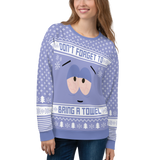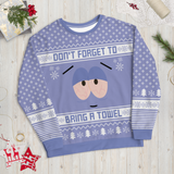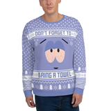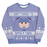 No matter where you roam this holiday season, you must remember one thing: never forget to bring a towel. With an all-over print design, this sweatshirt features Towelie on the front and Cartman, Kyle, Stan, and Kenny on the back. This comfortable South Park Towelie Ugly Holiday Sweatshirt is perfect to wear as you sing carols, decorate your home, or bake some special holiday brownies. This sweatshirt also makes a great gift for the biggest South Park fans.